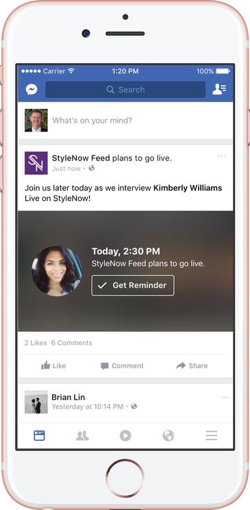Once a Live Video has been scheduled, Facebook sends out a broadcast alert to your users – popping the announcement into their News Feed. Users can then ‘opt-in’ to receive a reminder just before your video starts, and can then enter a ‘pre-broadcast chat room’ up to three minutes before go-time.
